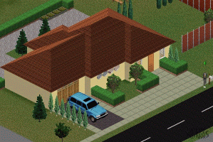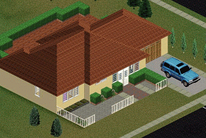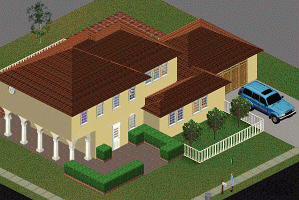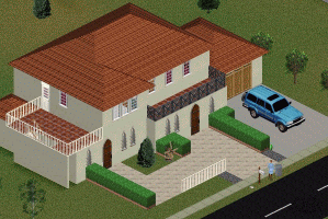 DESCRIPTION: This is a Spanish villa type house with 2 small bedrooms, a bath, kitchen, simulated garage, and backyard patio. SUV not included, only for show! (Car shown is available at Livin-it-up.net!)