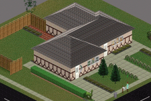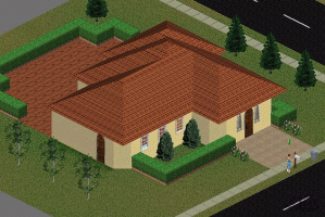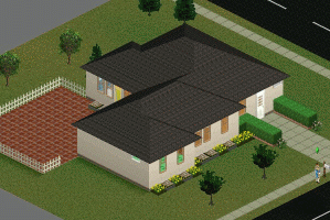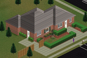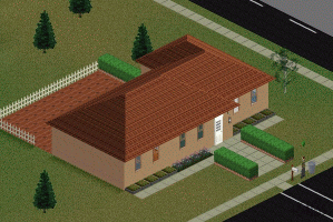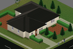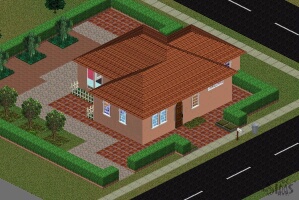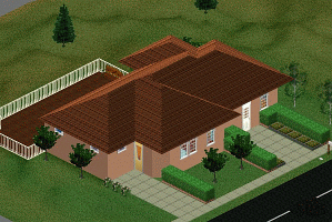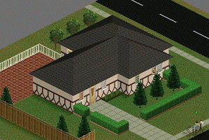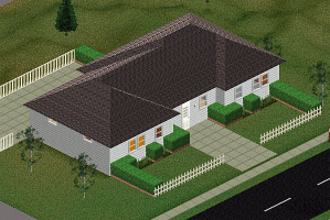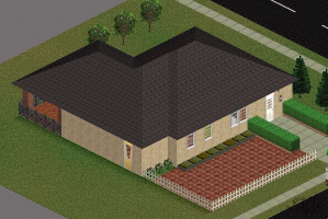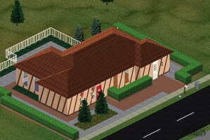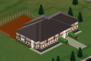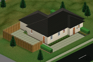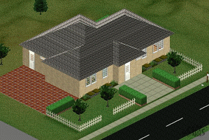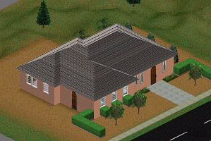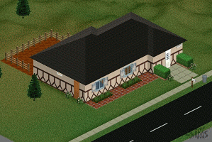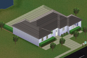 DESCRIPTION: One story bungalow with a large kitchen/ eating area, a medium-sized living room, and a medium-sized bedroom. Comes with a barbecue grill in the backyard. Perfect for a single Sim or newlyweds.