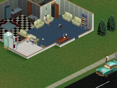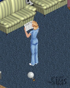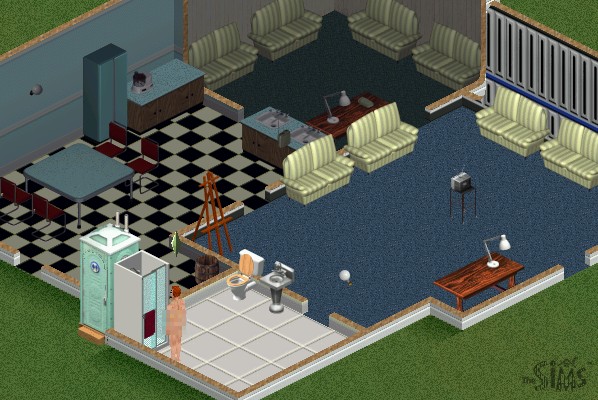 BTW, do you see something very different about the furniture in the picture above? Yes– I’ve moved four of the couches from the living room into the makeshift bedroom. Can you guess why? Because in the evenings, I started having a problem with sleepy Sims versus TV watching Sims. But now that I’ve moved two more sofas to the little bedroom, up to four Sims can sleep in solitude without being disturbed by the television set.