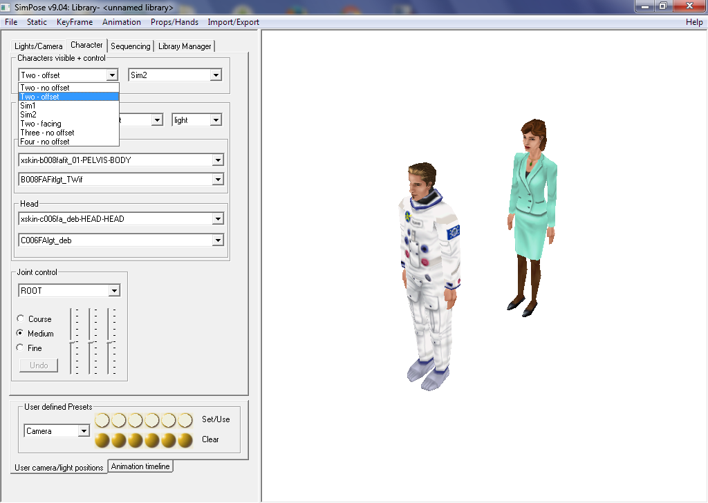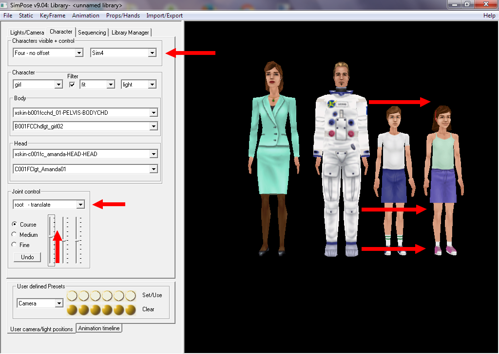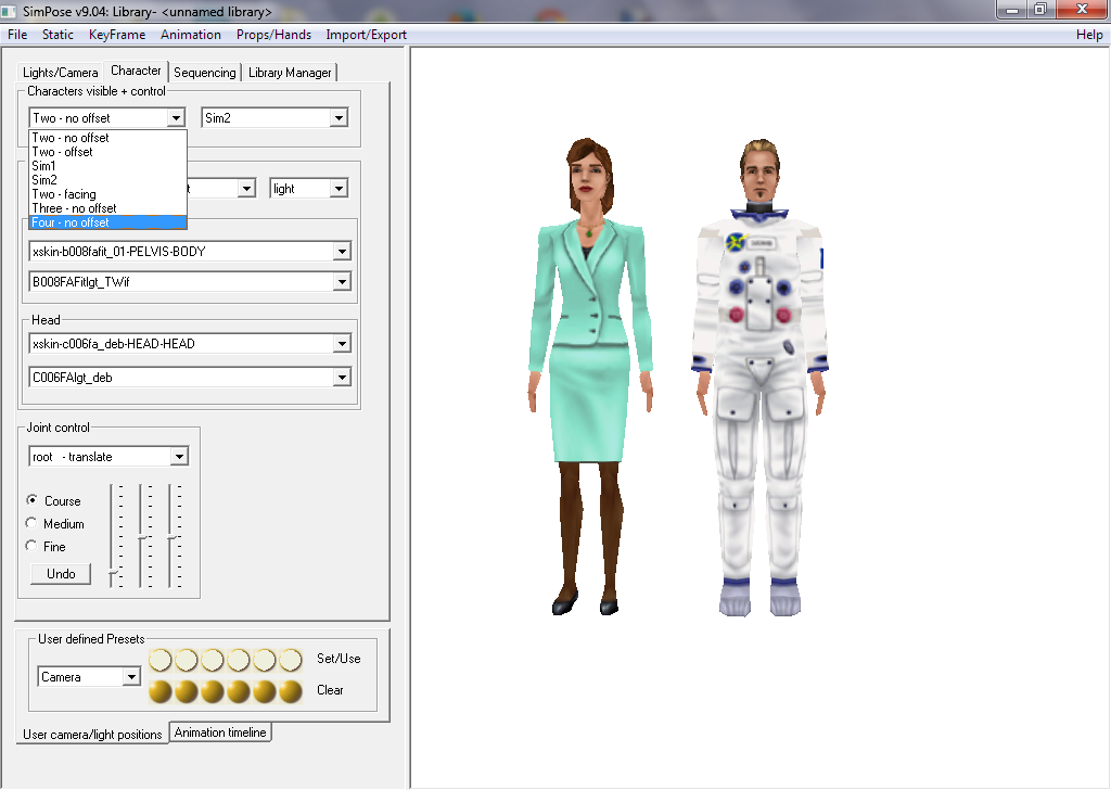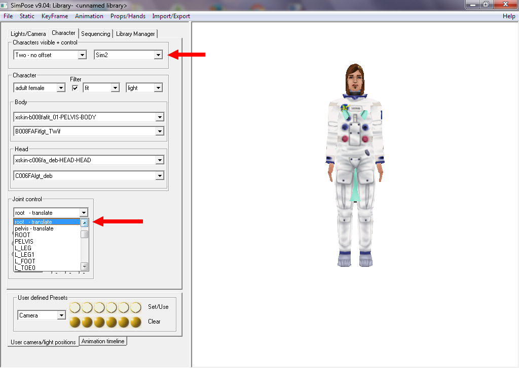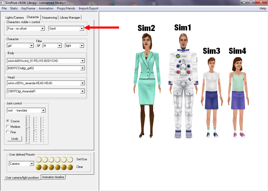 Step Five: Go Back to Character Tab and Select “Sim 2”Now that we have our two smushed sims facing us, it will be easier to start separating them and adding two more sims to our stage. To do this, let’s go back to the Character Tab. Now let’s take a look at the second drop down box in the area under “Characters visible + control.” In it, you should see either “Sim1” or “Sim 2.” What does this mean? Well, when you have more than one sim on the stage, you need to be able to pick the one that you want to pose. “Sim1” and “Sim 2” refers to each one of your sims. “Sim1” is the astronaut sim and “Sims 2” is the red-haired female sim. Got it? Good. So, to separate our sims, let’s start with Sim2. Make sure that “Sim2” is in the dropdown box. When she is, go all the way down to the “Joint Control” section.