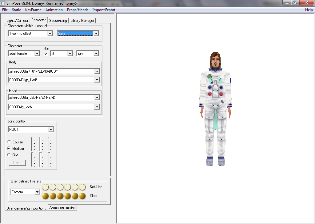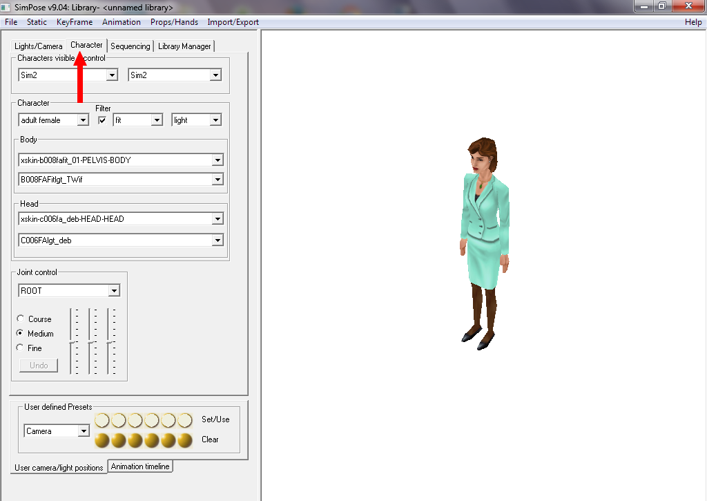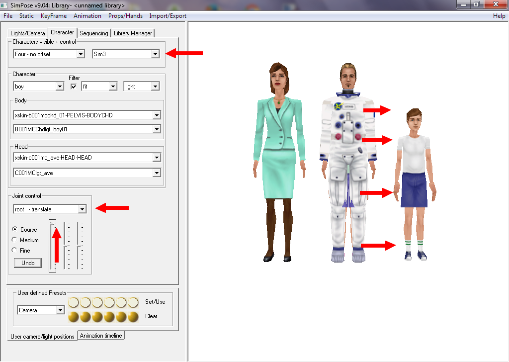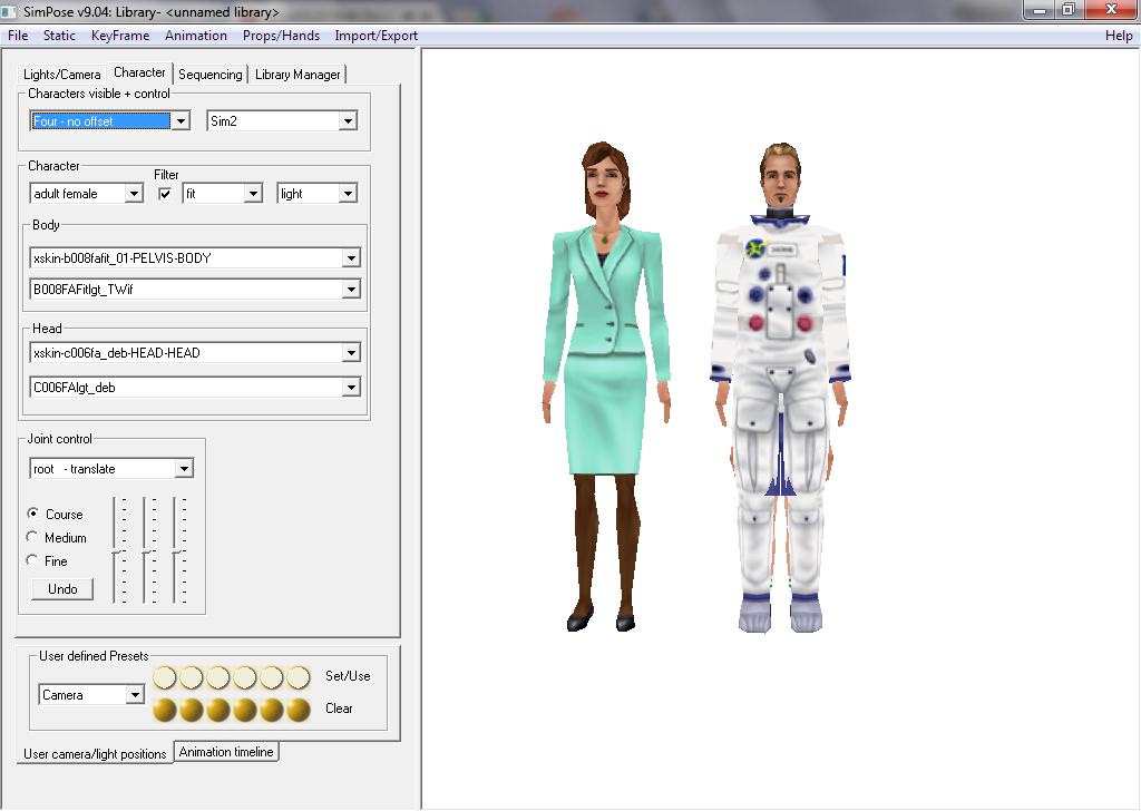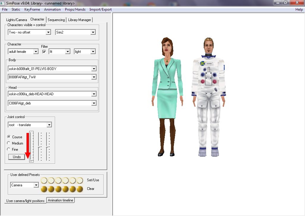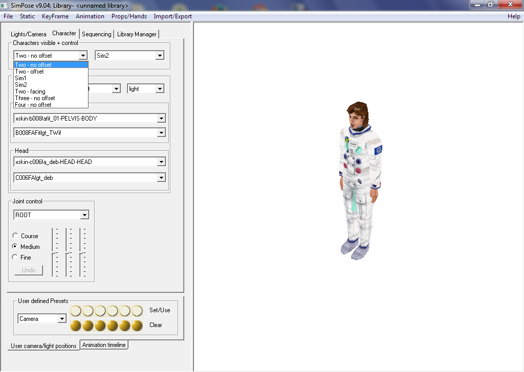 Step Five: Go Back to Character Tab and Select “Sim 2”Now that we have our two smushed sims facing us, it will be easier to start separating them and adding two more sims to our stage. To do this, let’s go back to the Character Tab. Now let’s take a look at the second drop down box in the area under “Characters visible + control.” In it, you should see either “Sim1” or “Sim 2.” What does this mean? Well, when you have more than one sim on the stage, you need to be able to pick the one that you want to pose. “Sim1” and “Sim 2” refers to each one of your sims. “Sim1” is the astronaut sim and “Sims 2” is the red-haired female sim. Got it? Good. So, to separate our sims, let’s start with Sim2. Make sure that “Sim2” is in the dropdown box. When she is, go all the way down to the “Joint Control” section.