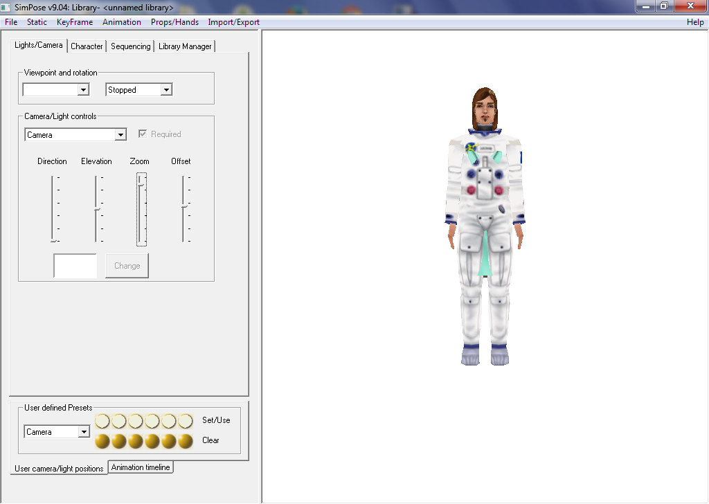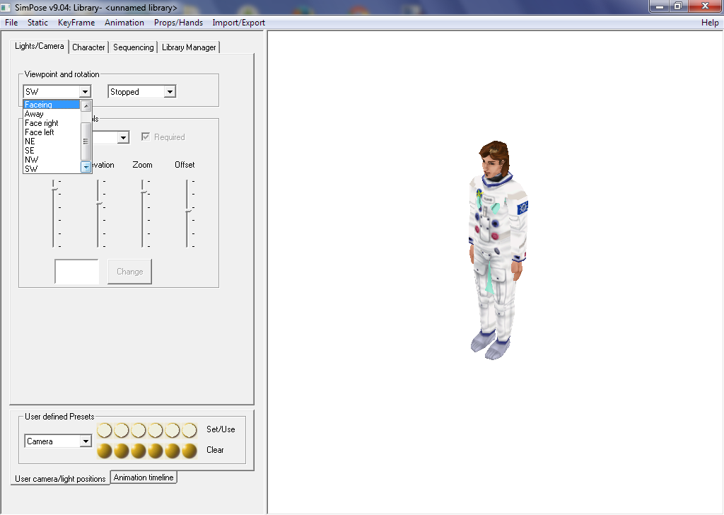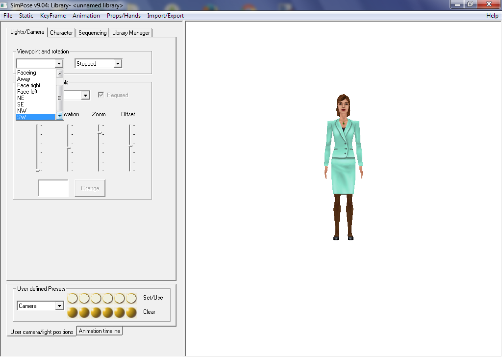 Step One: Put the Camera in SW ViewOpen up SimPose. You’ll see the default character, the red-haired female in an aqua business suit. If she is not in SW, go to and switch the camera to “SW” view so that we are looking down on her.