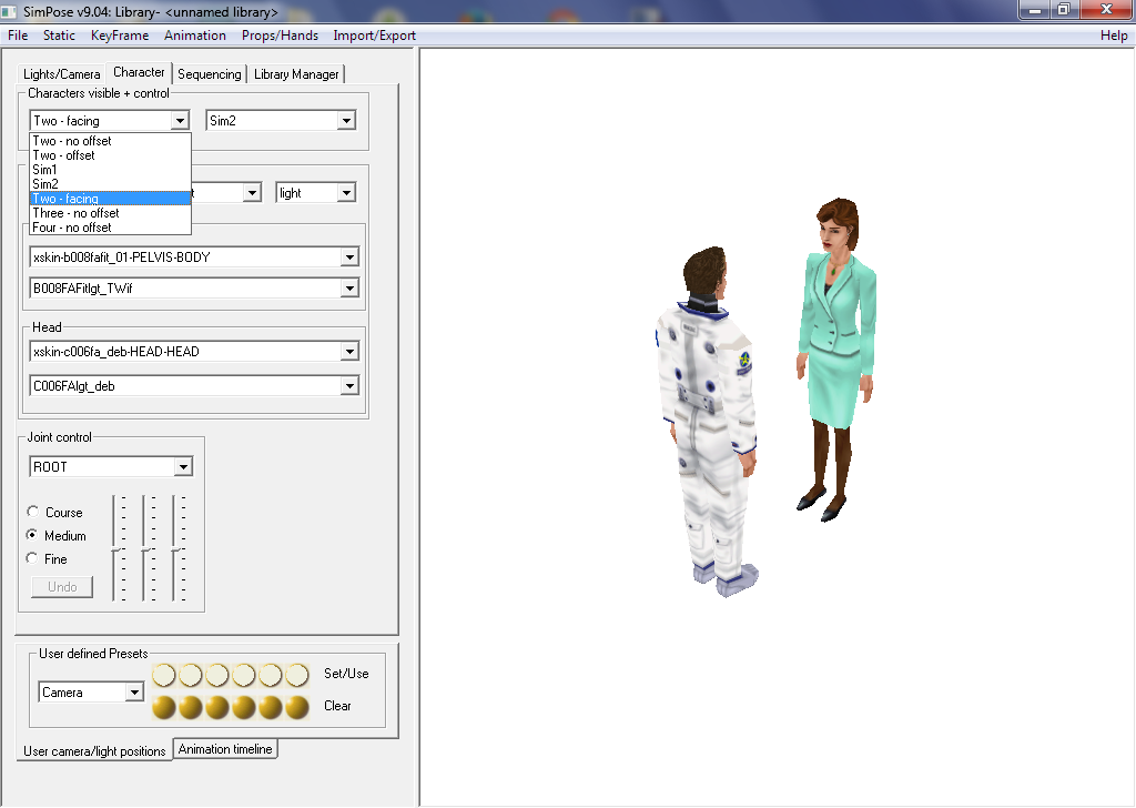 Step Four: Go to Lights/Camera Tab and Choose “Faceing”Keep the selection for your sims as “Two-no offset.” Now go back to the Lights/Camera and switch the camera to “Faceing” so that both sims are facing us head on. We need to do this to make it easier to “unsmush” our sims and pose them one by one.