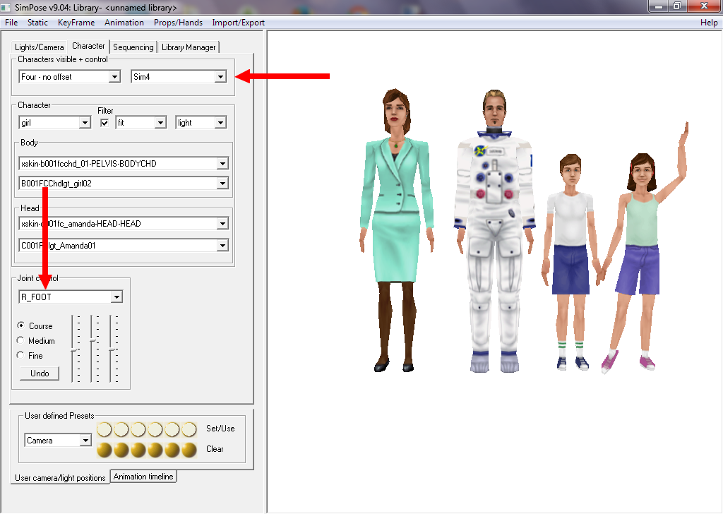 Step Ten: Let’s Pose Our Fourth SimTo pick which sim we want to pose, we have to choose the right Sim from the drop down menu under the Character Tab. Because we want to pose the fourth sim (the little girl), we need to select “Sim4.” Once we’ve selected Sims4, let’s drop down to “Joint Control.” From there, we can pose her arms, legs, head, shoulders and feet. If you don’t know how to pose limbs, read this basic tutorial. And that’s it! If you want to pose any of the other sims on the stage, just pick “Sim1”, “Sim2”, or “Sim3”, then go down to Joint control. Below is a diagram showing which sim corresponds with which option under the Character Tab.